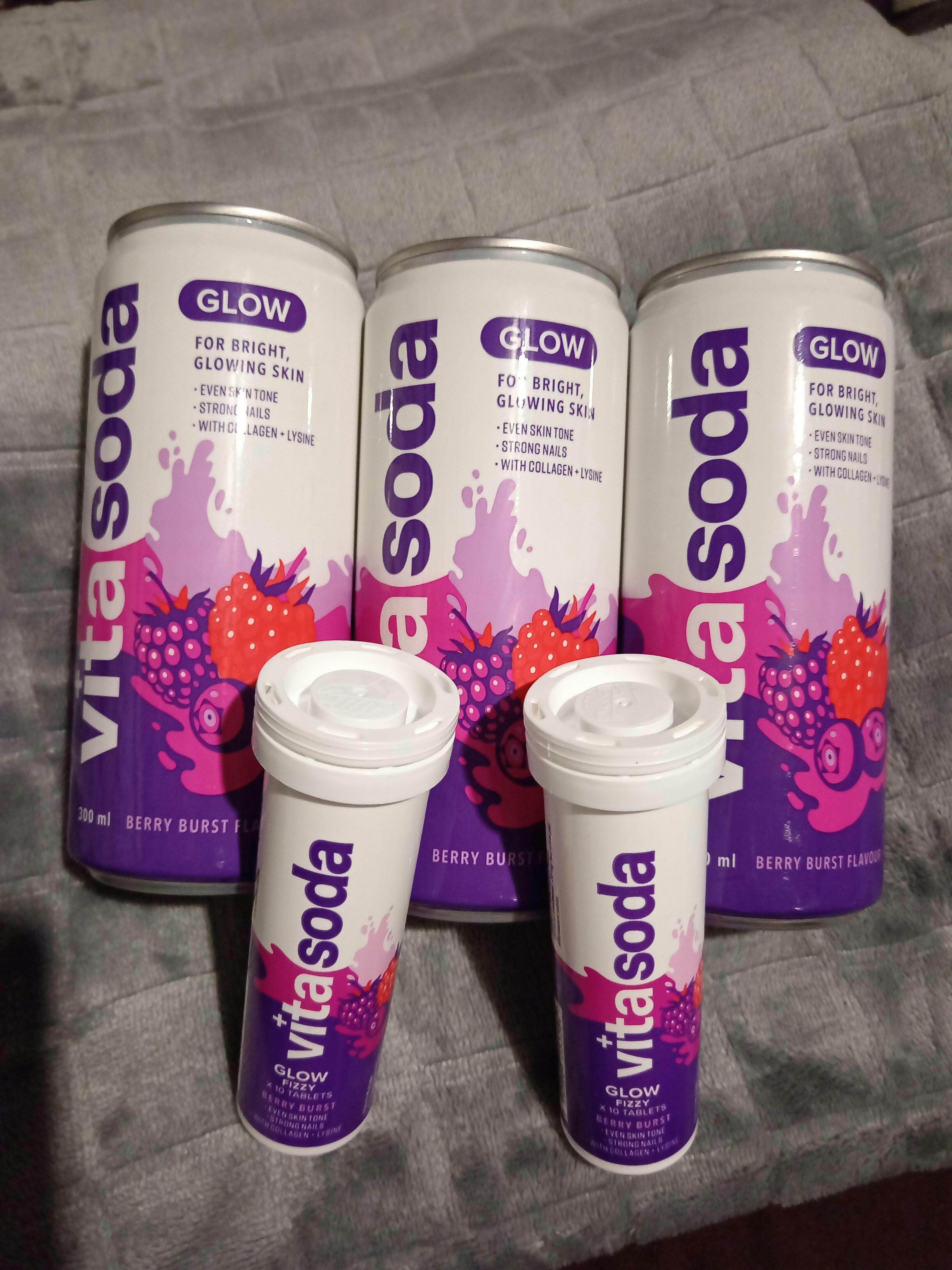 Vita Soda Glow Fizzy Tablets, your secret to glowing skin! Packed with Vitamin C, Lysine, Biotin, Zinc, Selenium, and Collagen Peptides, this fizzy tablet provides essential nutrients for a healthy glow from within. Enjoy the delicious Berry Burst flavour while experiencing benefits like even skin tone and stronger nails.